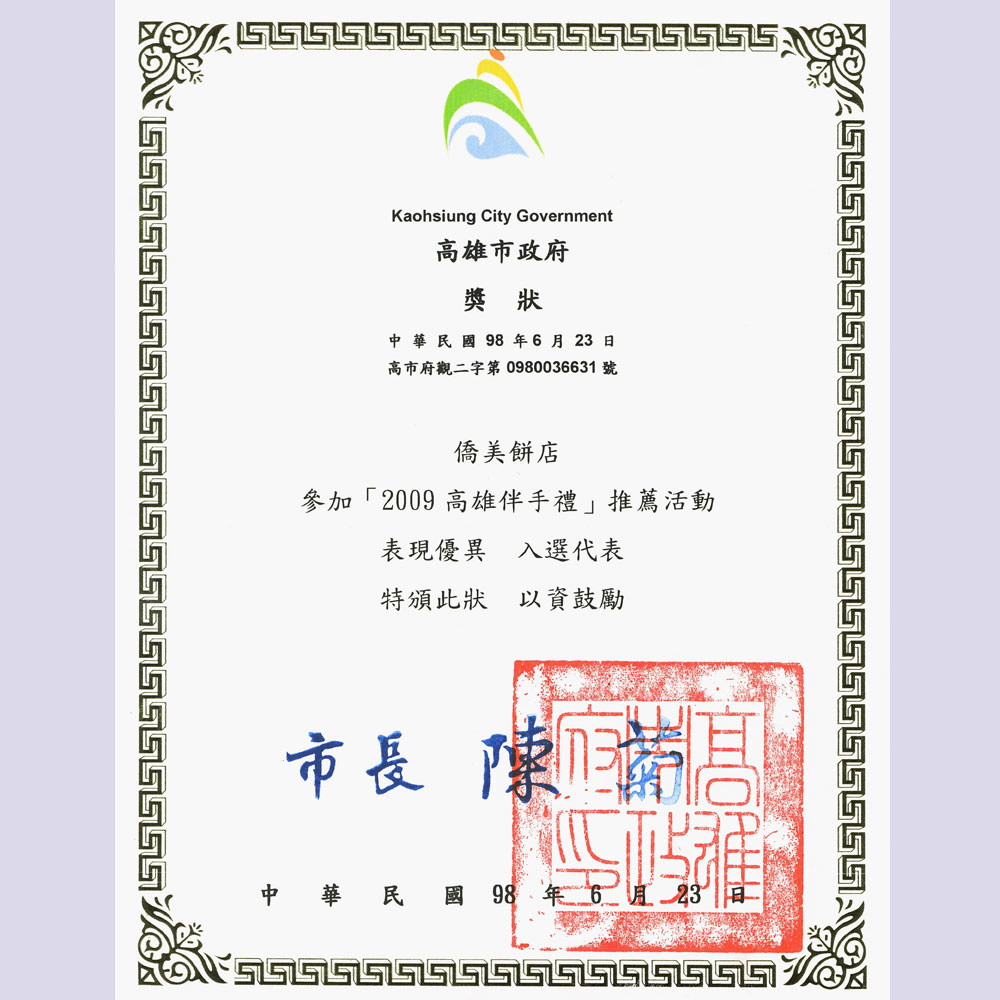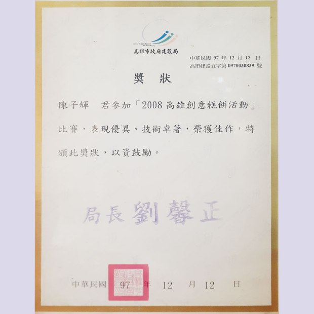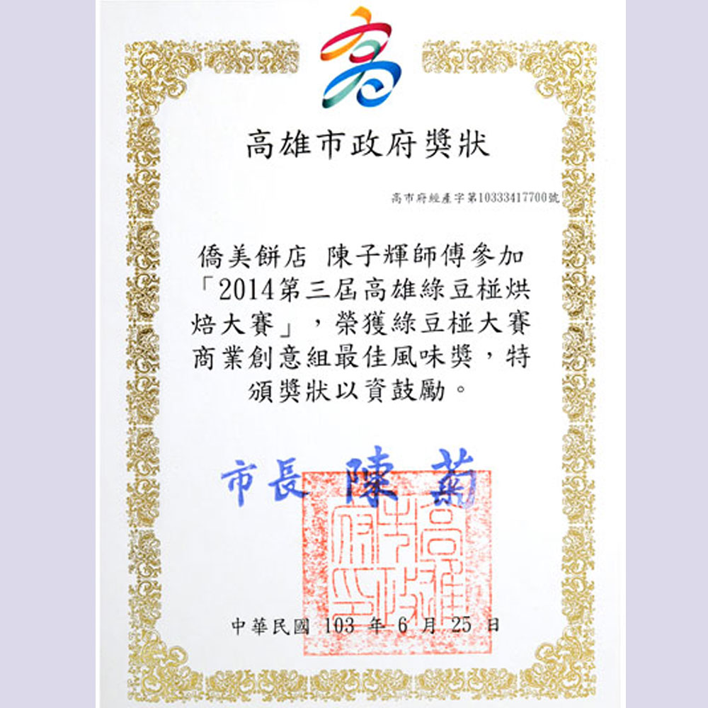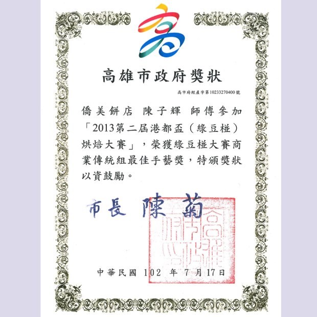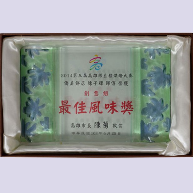 得獎紀錄 2016年高雄綠豆椪大賽 2016年高雄綠豆椪大賽頒獎 2016年高雄綠豆椪大賽優選賞 2021台灣百大糕餅伴手禮 2014創意組最佳風味獎 2007高雄最佳伴手禮 2008高雄創意糕餅賽 2013港都盃綠豆椪烘焙大賽 2009高雄伴手禮 綠豆椪烘焙大賽最佳風味獎